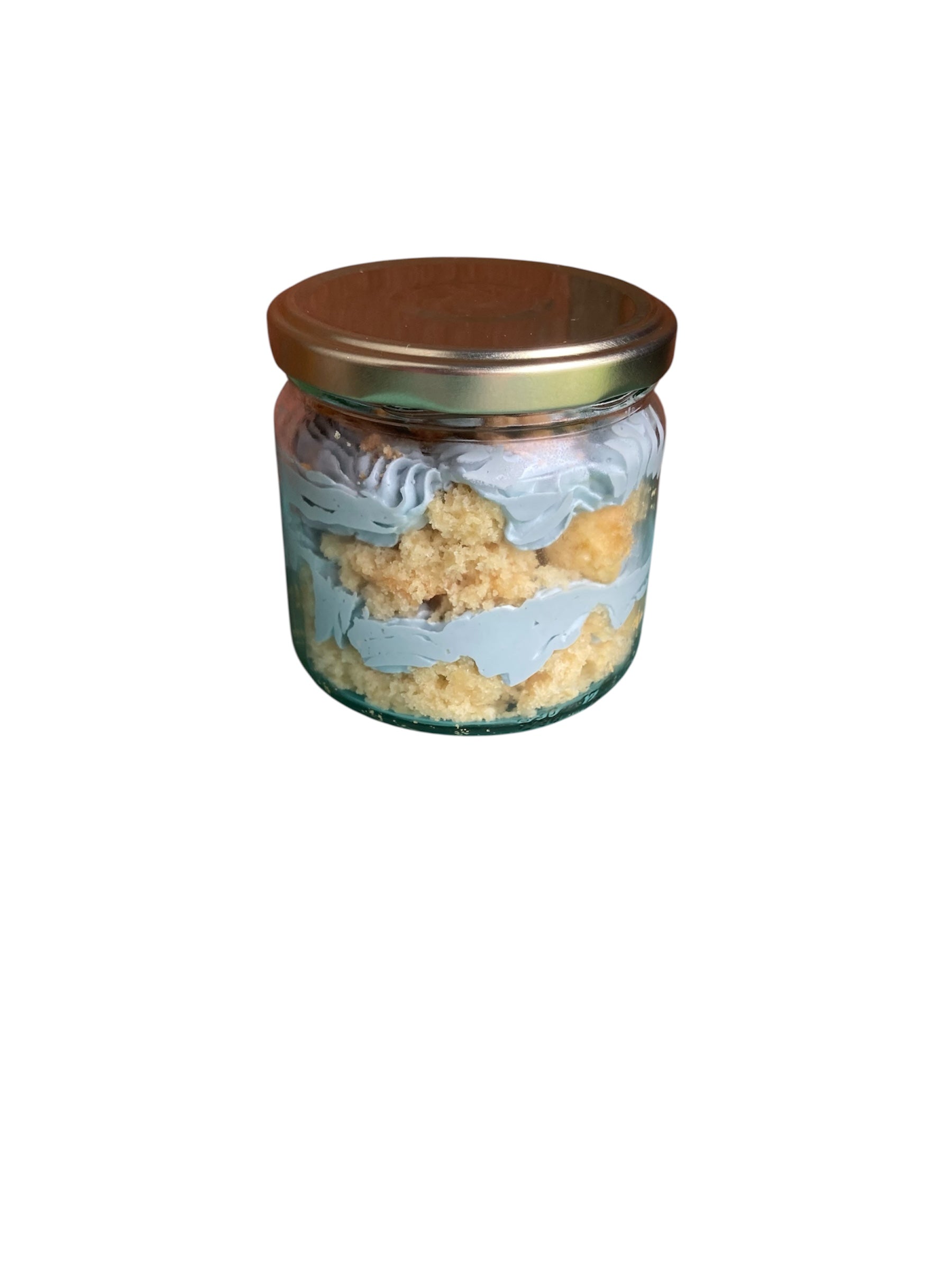 Glazen pot gevuld met laagjes vanille cake en blauwe vanille botercréme , afgetopt met stukjes koek en oogjes