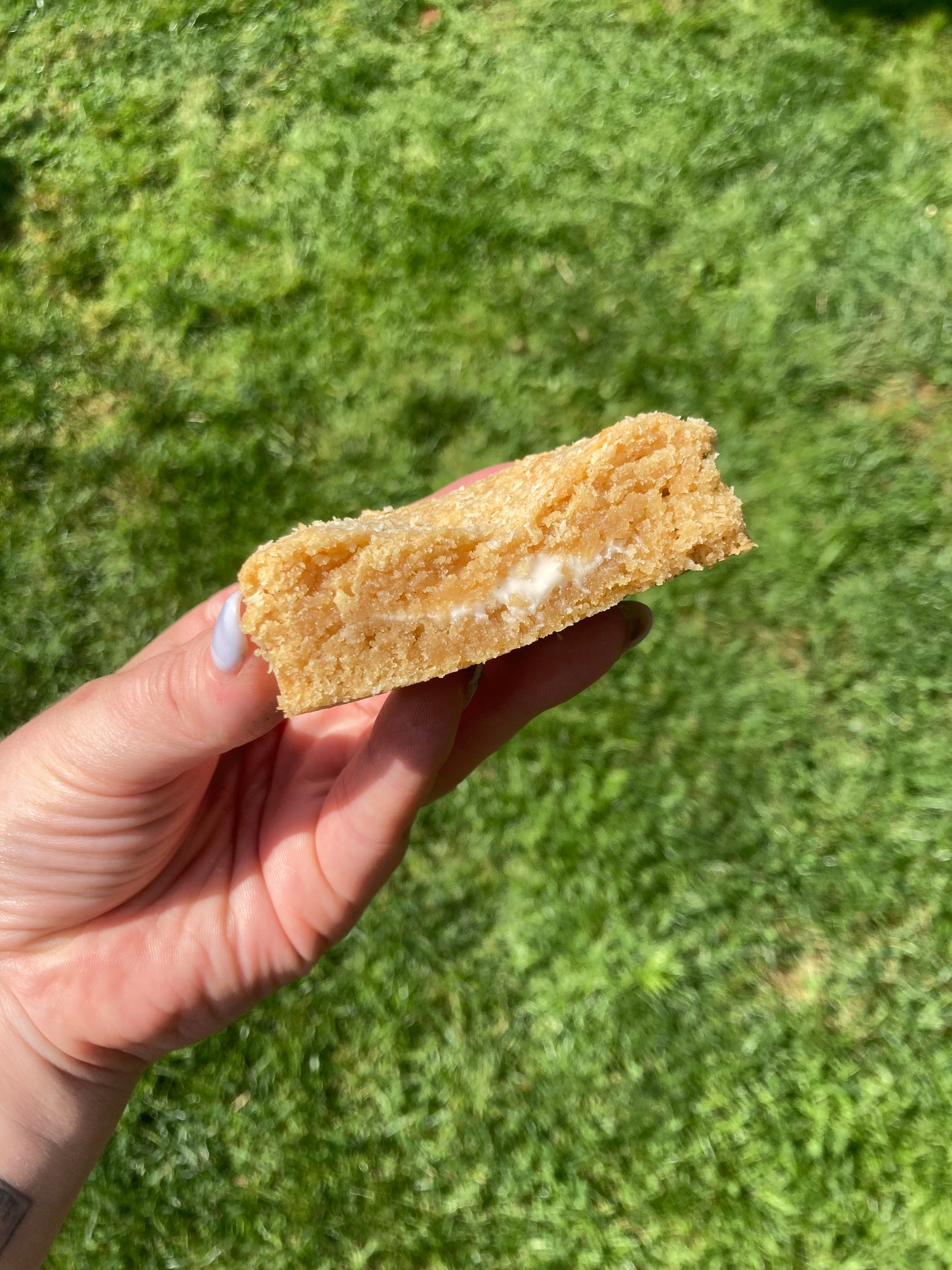 Stuffed cookie van vanille deeg, gevuld met romige kokospasta en gerold door geraspte kokos.